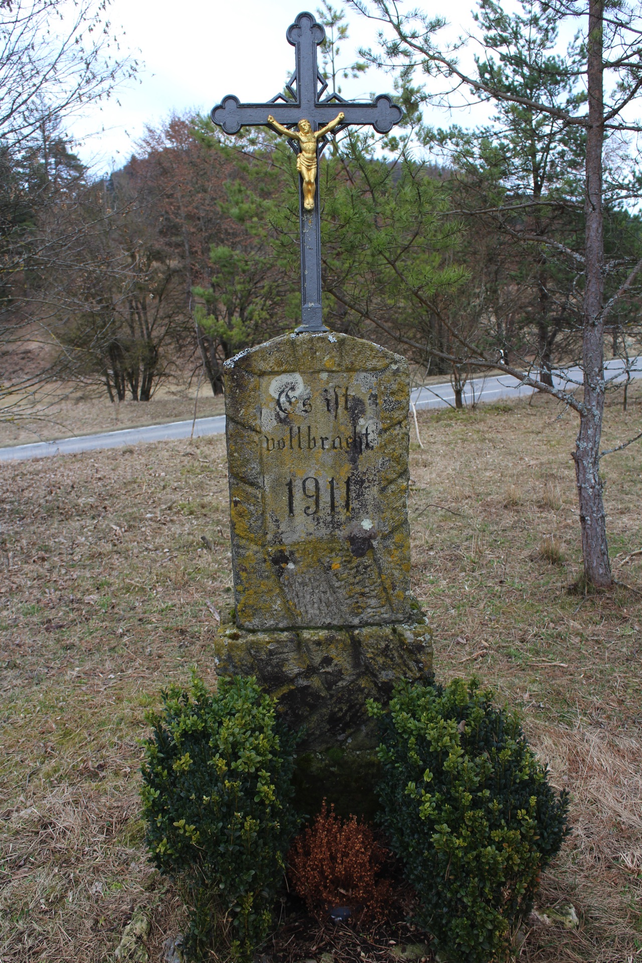 Das Kreuz trägt im Sockel aus hellem Schilfsandstein die Inschrift: