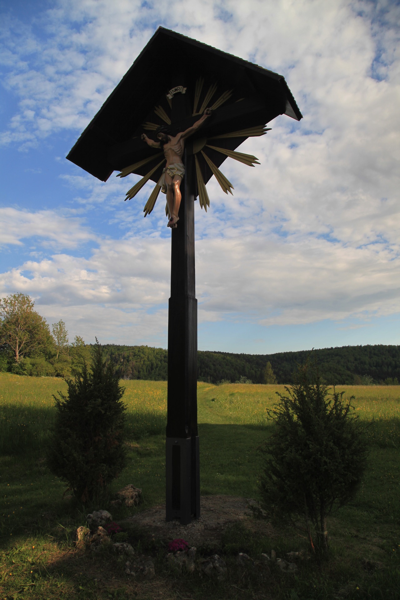 Dieses Kreuz ist bereits 1661 und 1756 erwähnt. In einer Karte um 1780 ist es als Holzkreuz mit den kleeblattartig ausgeformten Balkenenden ohne Korpus dargestellt. Der Volksmund nennt das Kreuz ´s Härlikreuz. Es wurde 1909 neu errichtet und von Stadtpfarrer Bernhard Rueß am 25. April 1909 wieder geweiht. Eine weitere Erneuerung des Kreuzes fand auf Initiative von Eugen Schiele 1968 statt, das Holz stellte die Stadtverwaltung zur Verfügung. Zusätzlich zum schon vorhandenen Holzdach erhielt das neue Kreuz eine rückwärtige Verkleidung aus Holz mit einem Strahlenkranz. Aufgestellt wurde es von Eugen Schiele unter Mithilfe von Meinrad Burth, Irndorf, und Eugen Sattler. Im Kreuzstamm ist die Jahreszahl 1968 angebracht. 1997 wurde das Härlikreuz von Eugen Schiele und Albrecht Mayer gründlich gereinigt und gerichtet. 2011 wurde der Korpus neu bemalt.